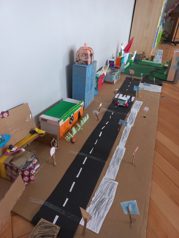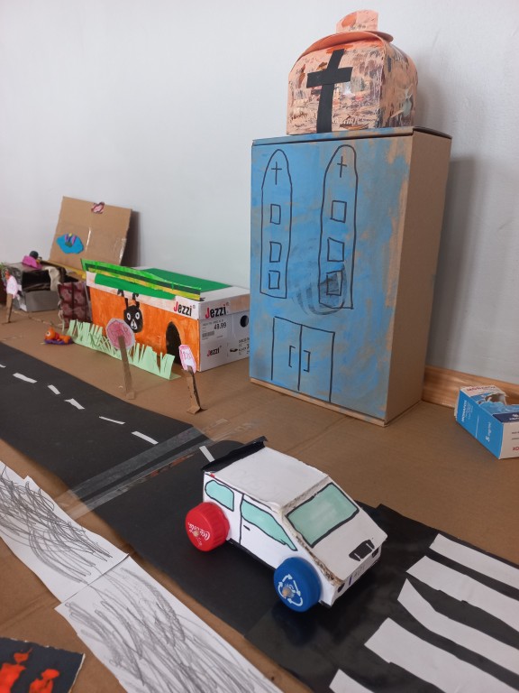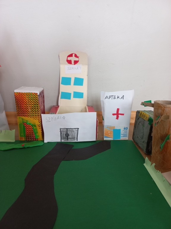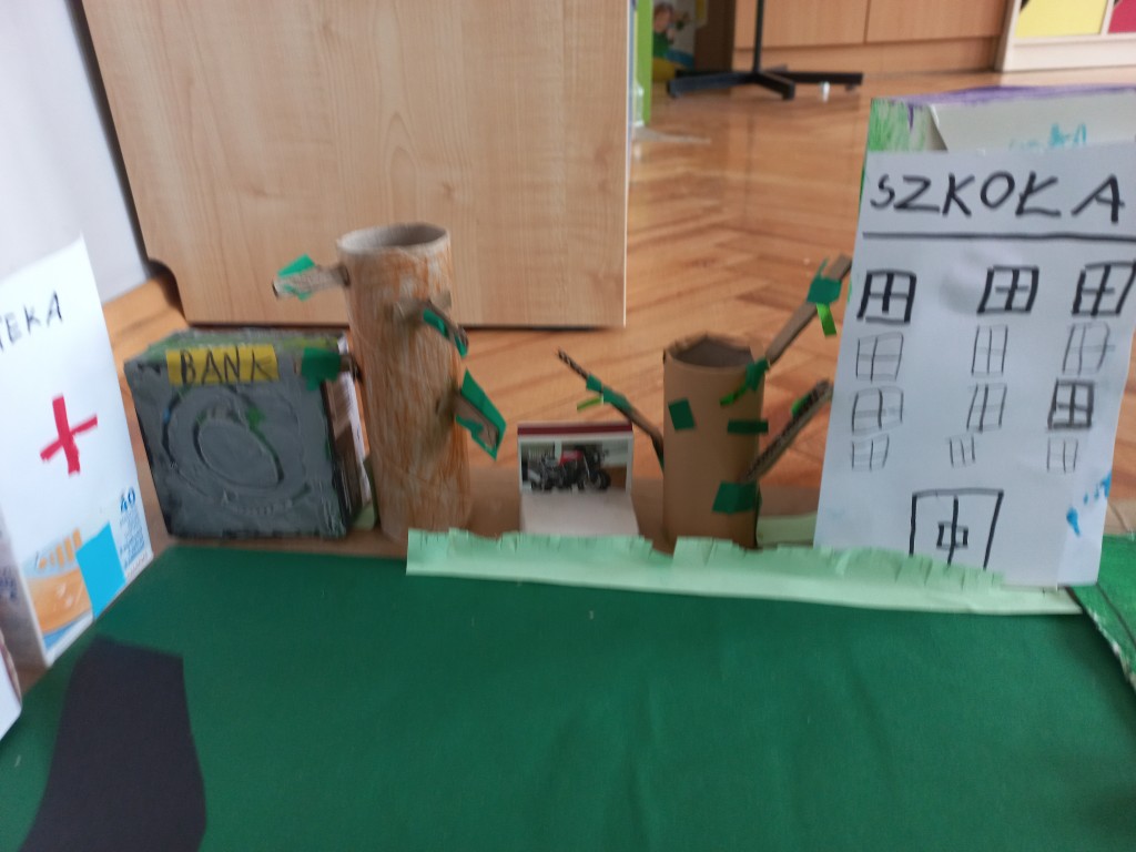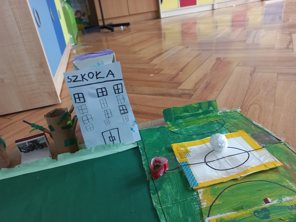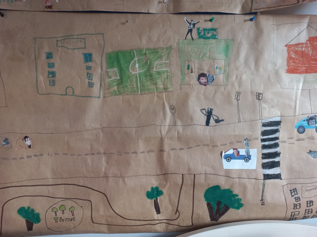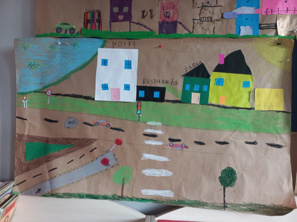 Na podstawie przygotowanych prac odbyły się także ciekawe zajęcia o bezpieczeństwie w mieście oraz o budynkach użyteczności publicznej – dzieci mogły dowiedzieć się, gdzie szukać pomocy, jak bezpiecznie poruszać się po ulicach i jakie znaczenie mają różne miejsca w naszym codziennym życiu. Takie działania to nie tylko nauka przez zabawę, ale również budowanie świadomości społecznej i kształtowanie odpowiedzialnych postaw. Efekty pracy były naprawdę imponujące – zarówno makieta, jak i plakaty pełne były kolorów, szczegółów i dziecięcej fantazji.