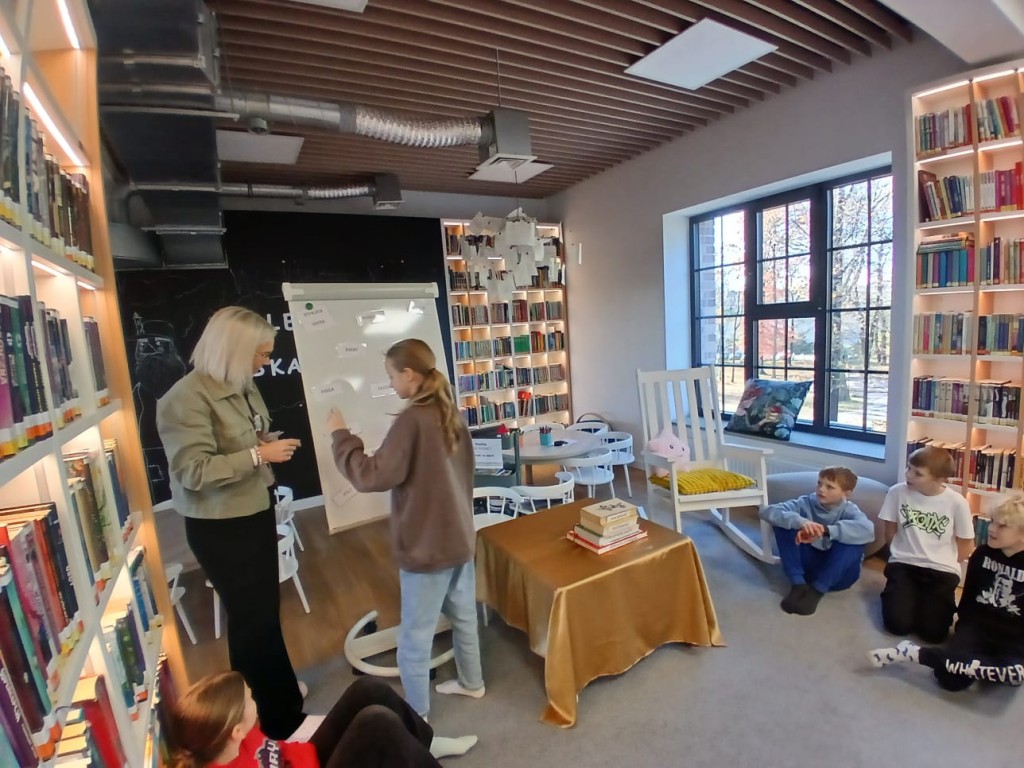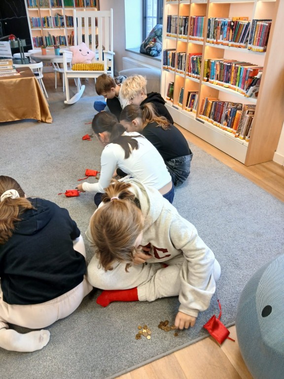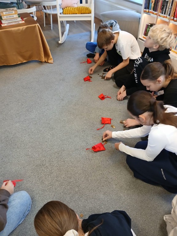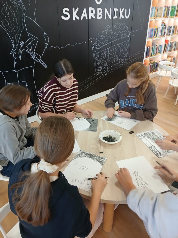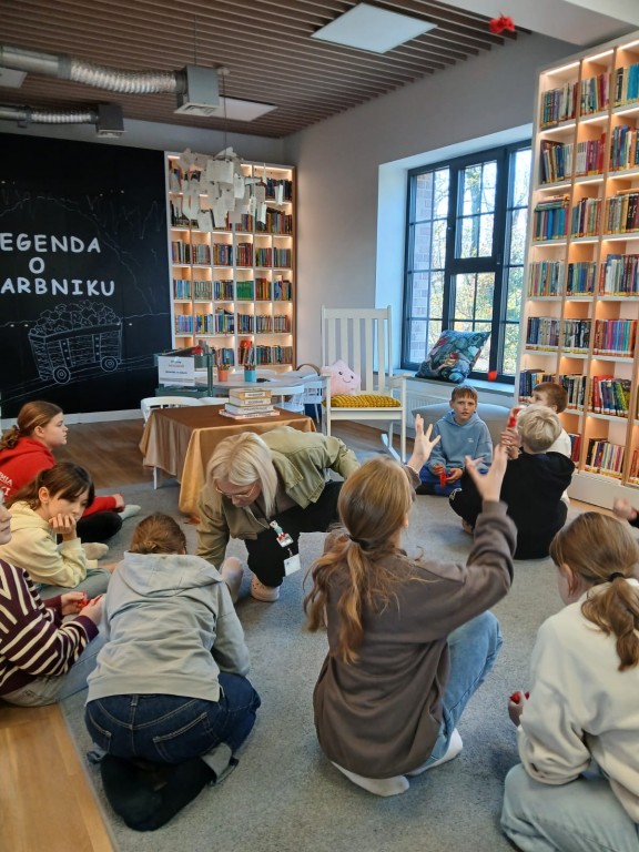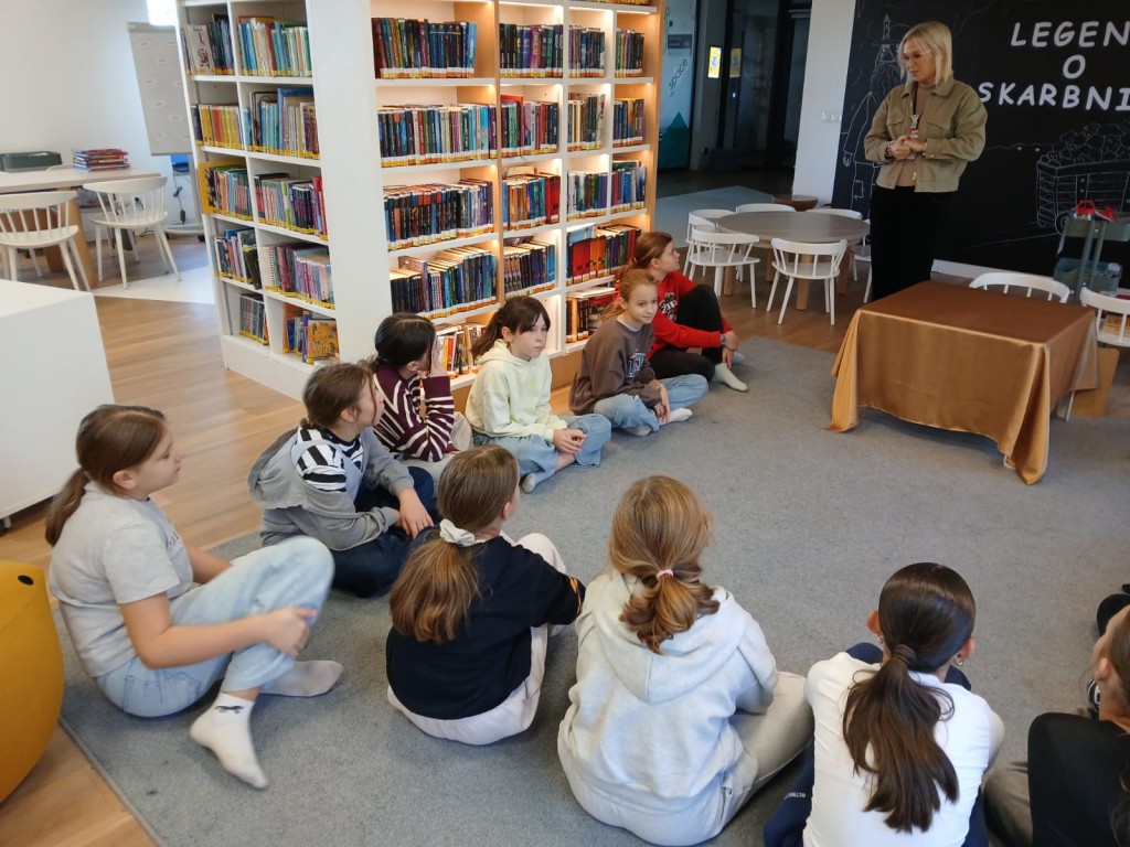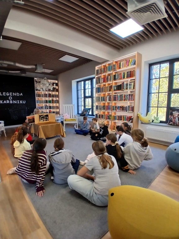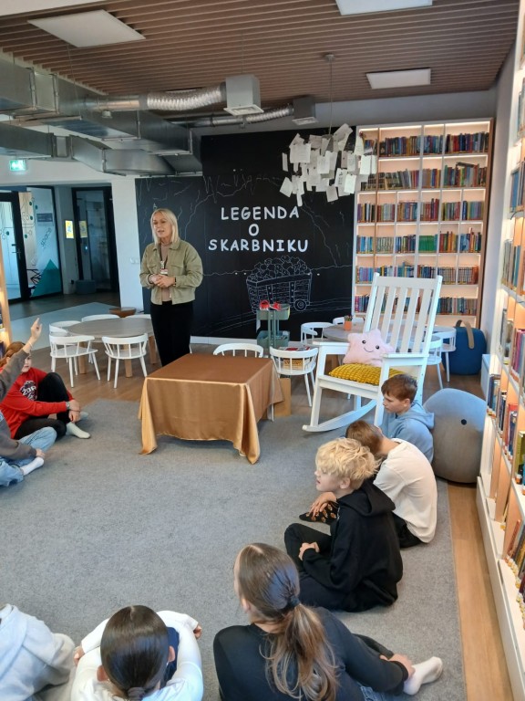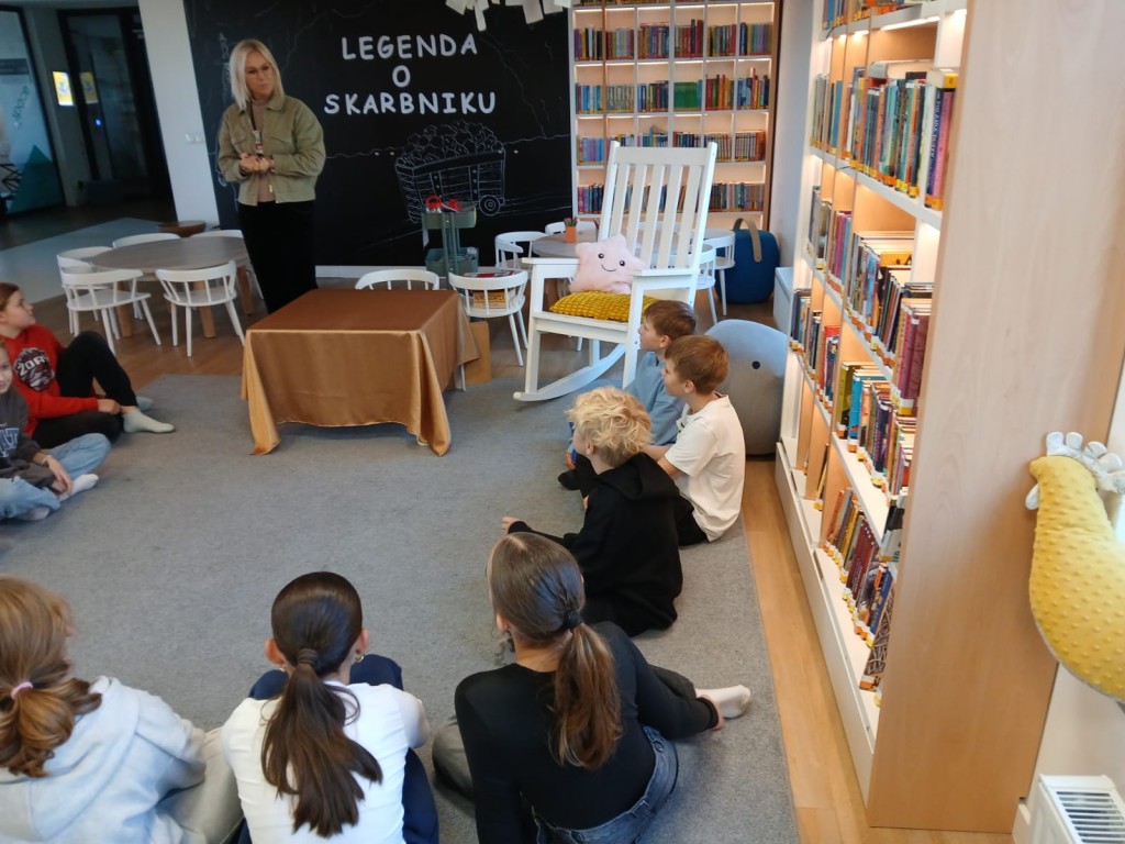 4 listopada 2025 roku klasa 5a wraz z wychowawcą udała się do biblioteki do Żor. Tam odbyła się lekcja biblioteczna "Legenda o skarbniku". Najpierw uczniowie wysłuchali teatrzyku kamishibai, potem rozmawiali o szczerości, sprawiedliwości, solidności i odwadze cywilnej. Odgadywali słówka śląskie, liczyli pieniądze w sakiewkach oraz malowali węglem prace plastyczne o trudnej pracy na kopalni i skarbniku. Potem zwiedzali całą bibliotekę, która wcześniej była młynem. Na zakończenie oglądaliśmy w kinie film "Złodziej pioruna" na podstawie książki Ricka Riordana.