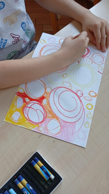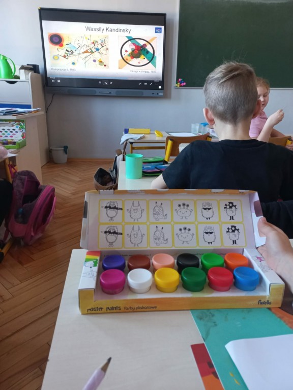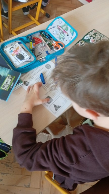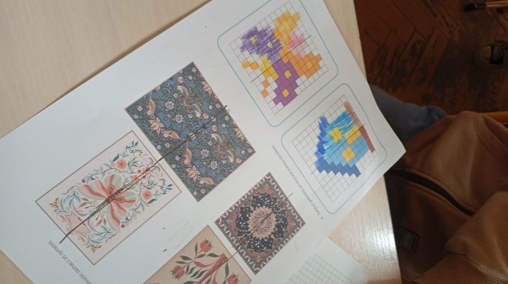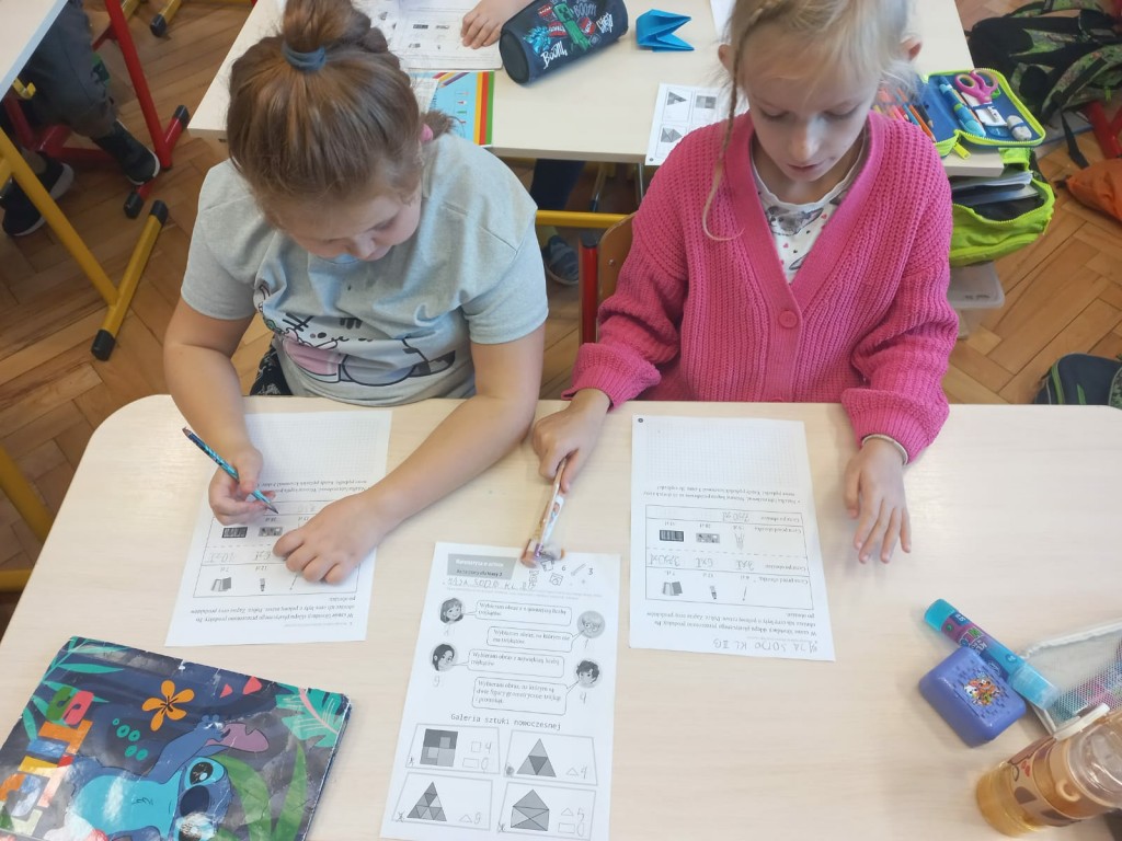 Podczas zajęć rozmawialiśmy o figurach geometrycznych, symetrii oraz o tym, jak artyści wykorzystują matematyczne zasady w swoich pracach. Uczniowie z ogromnym zaangażowaniem wyszukiwali przykłady symetrii w otoczeniu oraz tworzyli własne pomysły.
