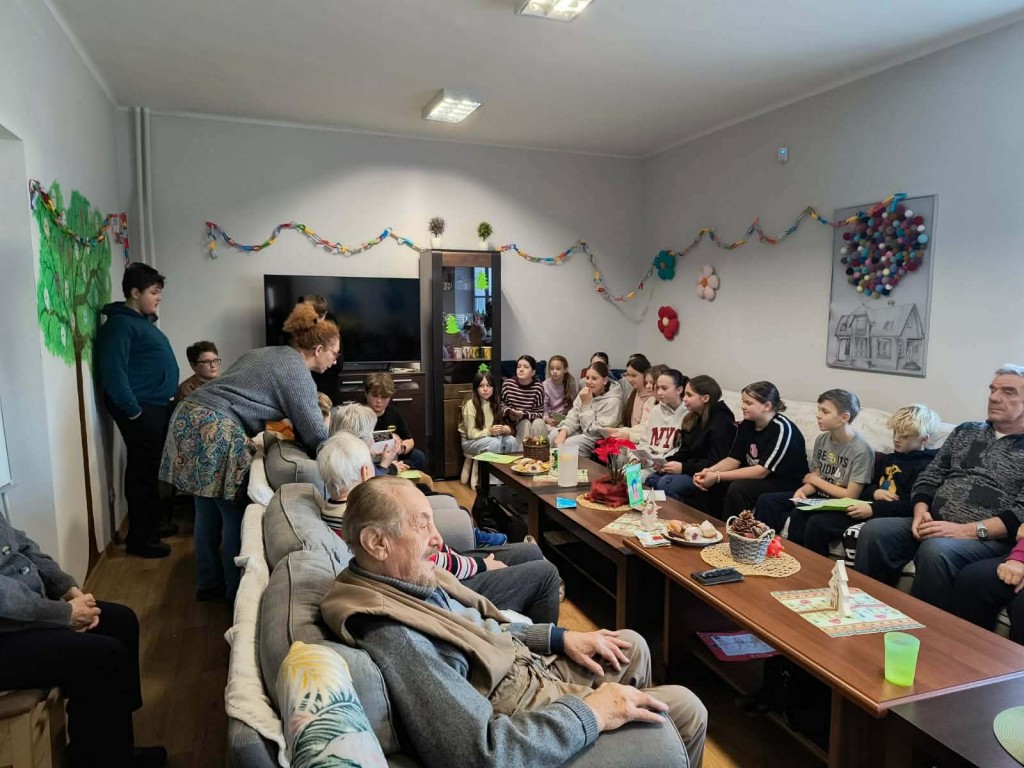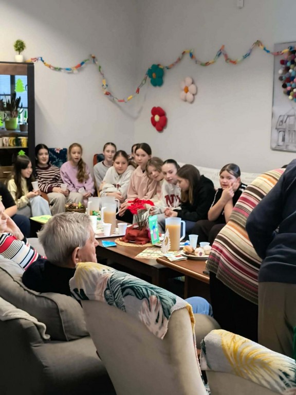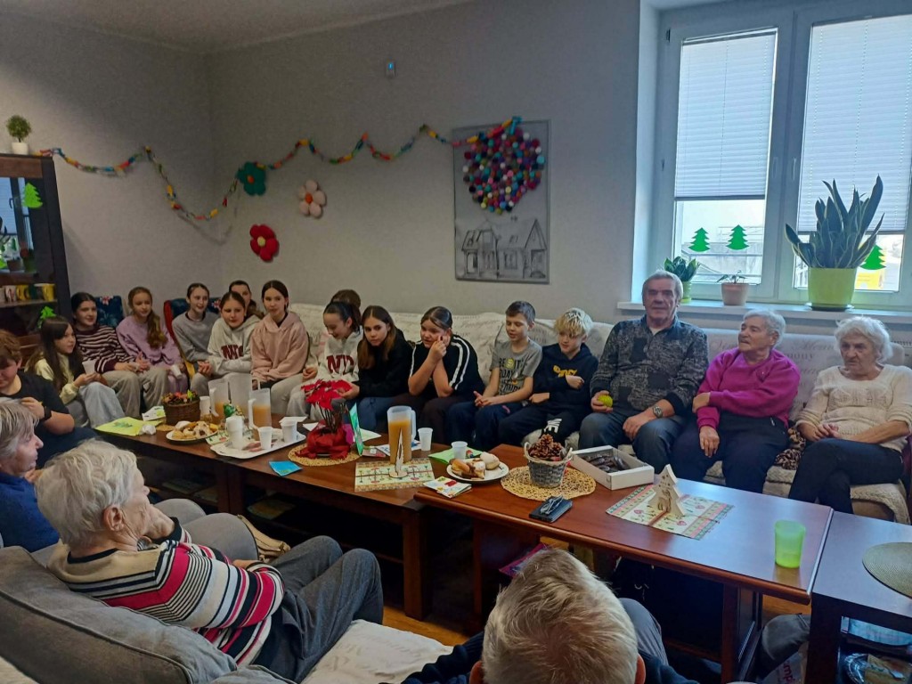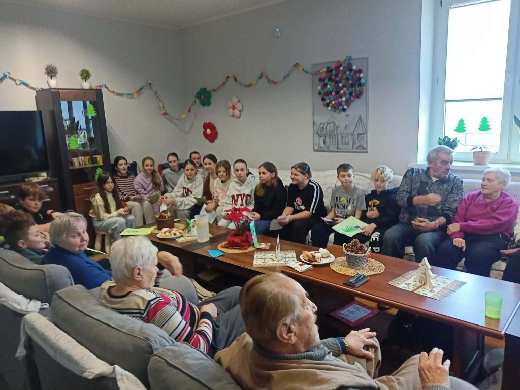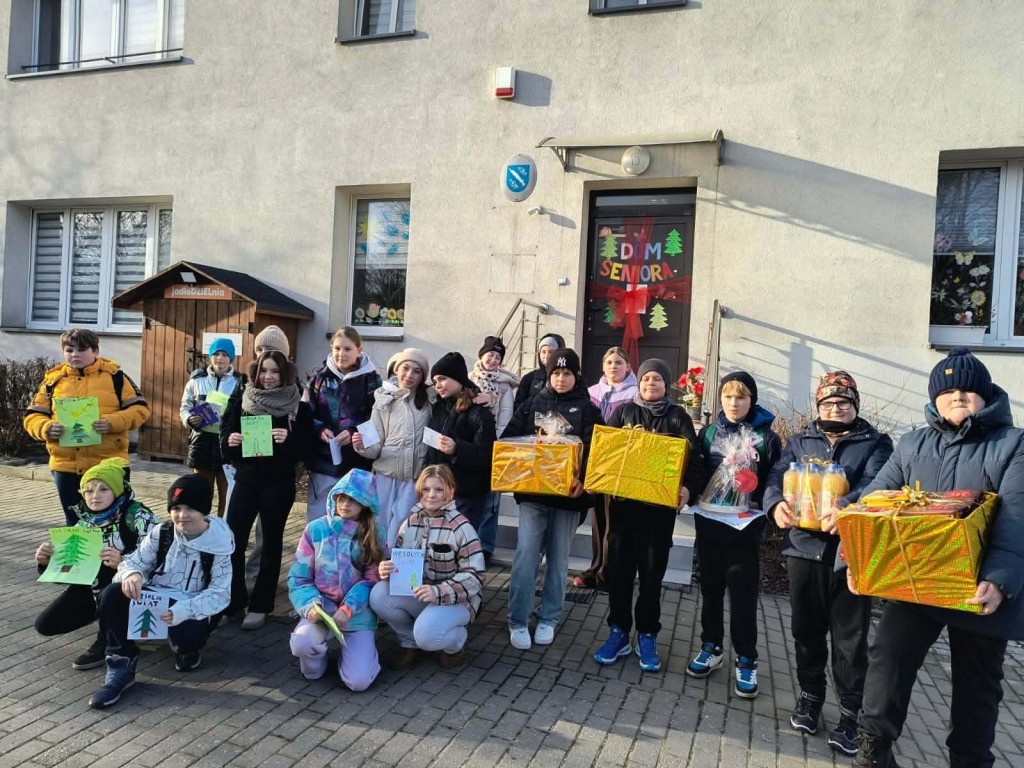 Z radością informujemy, że dostarczyliśmy do Domu Seniora w Niewiadomiu rzeczy zakupione z funduszy zebranych podczas kiermaszu niepodległościowego. W ramach wspólnego kolędowania uczniowie klasy 5a i 6a wręczyli własnoręcznie wykonane kartki z życzeniami, a reprezentanci klasy 6a przekazali przygotowane z własnej inicjatywy paczki świąteczne przez co udowodnili, że chętnie niosą radość i pomoc innym. Spotkanie upłynęło w niezwykle ciepłej, świątecznej atmosferze – nie zabrakło życzeń, przekazanych darów oraz wspólnego kolędowania, które sprawiło seniorom wiele radości. Dziękujemy wszystkim zaangażowanym uczniom, rodzicom i nauczycielom. Wspólnie udało się zrealizować działania patriotyczne w praktyce, rozwijające empatię i łączące pokolenia. Liczymy na dalszą owocną współpracę w nadchodzącym Nowym Roku.